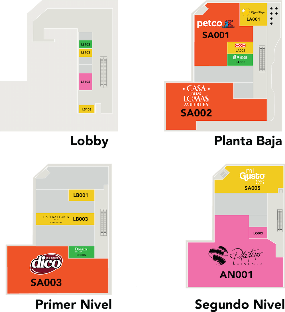 AT&T, Cinemex Platino, Casa de las Lomas, Dico, Mi Gusto Es, La Trattoria, Pizza Plaza, Bancomer
