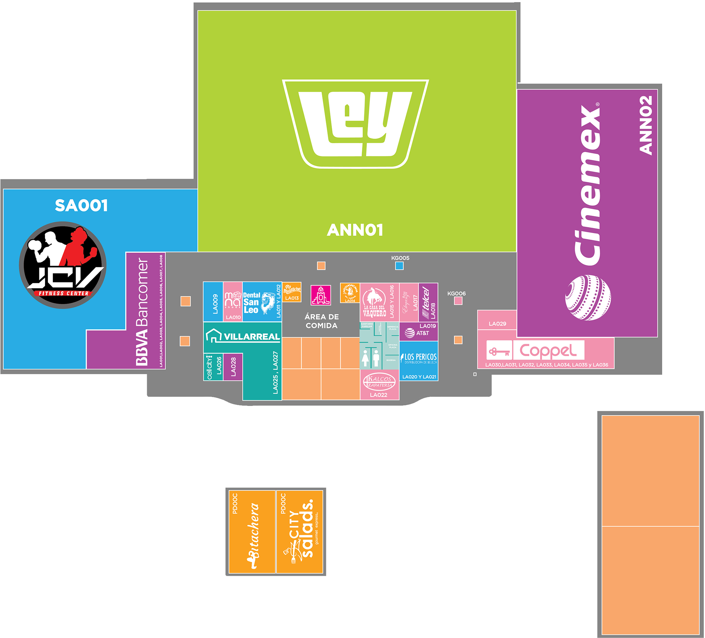 BBVA Bancomer, Coppel, Muebleria Villareal, Dentistas San Leo, Mustache, La Casa del Vaquero, La Michoacana, Kalcos Zapatería, Cafre Boutique, Los Pericos, AT&T, Mona Shoes